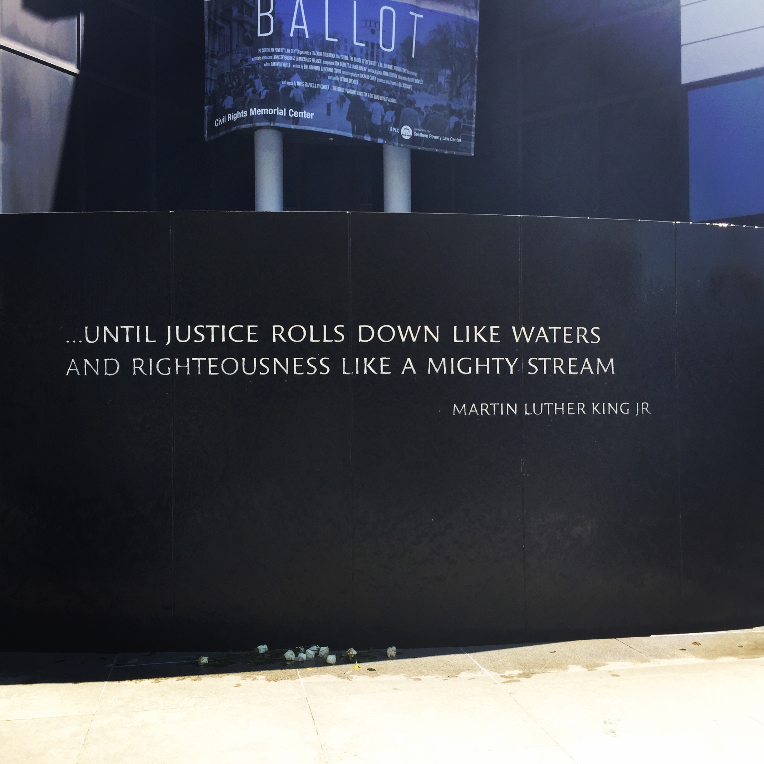 Just down the street from the Baptist church is the Civil Rights Memorial. There is a beautiful water installation in the front of the building. There are two parts of the installation. One is a stone waterfall bearing part of the Martin Luther King quote, “We will not be satisfied until justice rolls down like waters and righteousness like a mighty stream.”