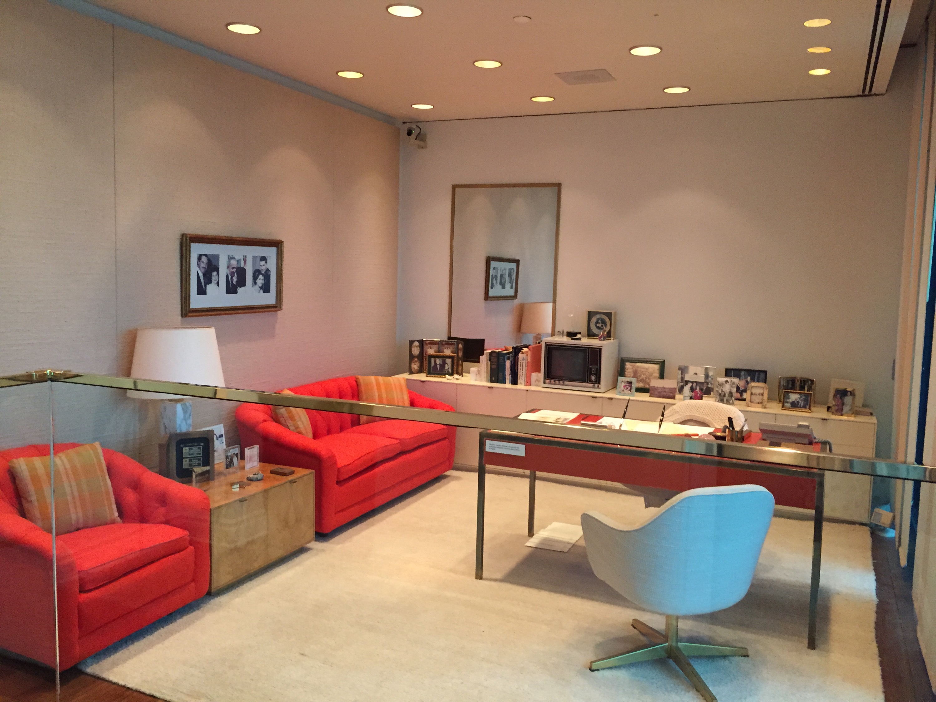 The museum had several different sections. There were timelines, audio recordings of LBJ’s phone conversations with people like MLK, lots of trinkets and memorabilia (campaign posters and pins, old school reports, etc). But one of my favorite parts of the museum was the recreation of LBJ’s and Lady Bird’s offices. How sweet and colorful is Lady Bird’s decor?